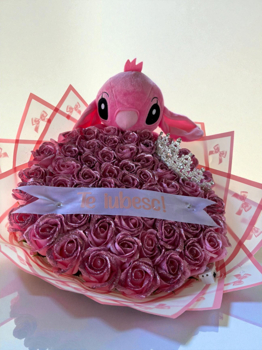 Buchetul contine 101 trandafiri roz deschis cu sclipici, stitch și coronita M-L. Panglica nu este inclusă în preț. Dacă doriți să adăugați panglică, vă rugăm să selectați opțiunea disponibilă.