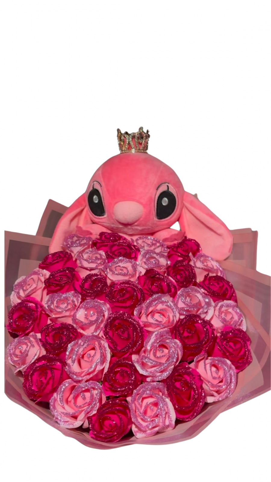 Buchetul contine 37 trandafiri din sapun,sclipici,stitch si coronita.