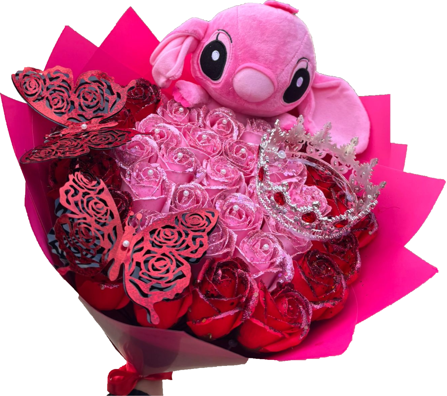 Buchetul contine 51 trandafiri din sapun, stitch-ul,coronița M-L,sclipici și fluturi.