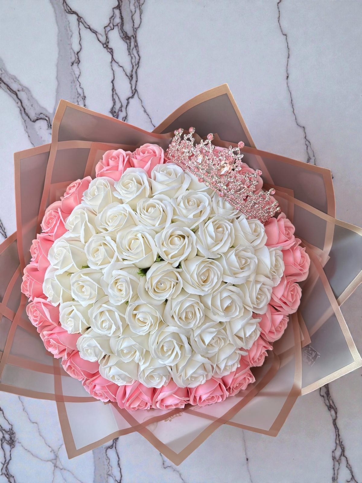 Buchetul contine 57 trandafiri din sapun și coroniță.