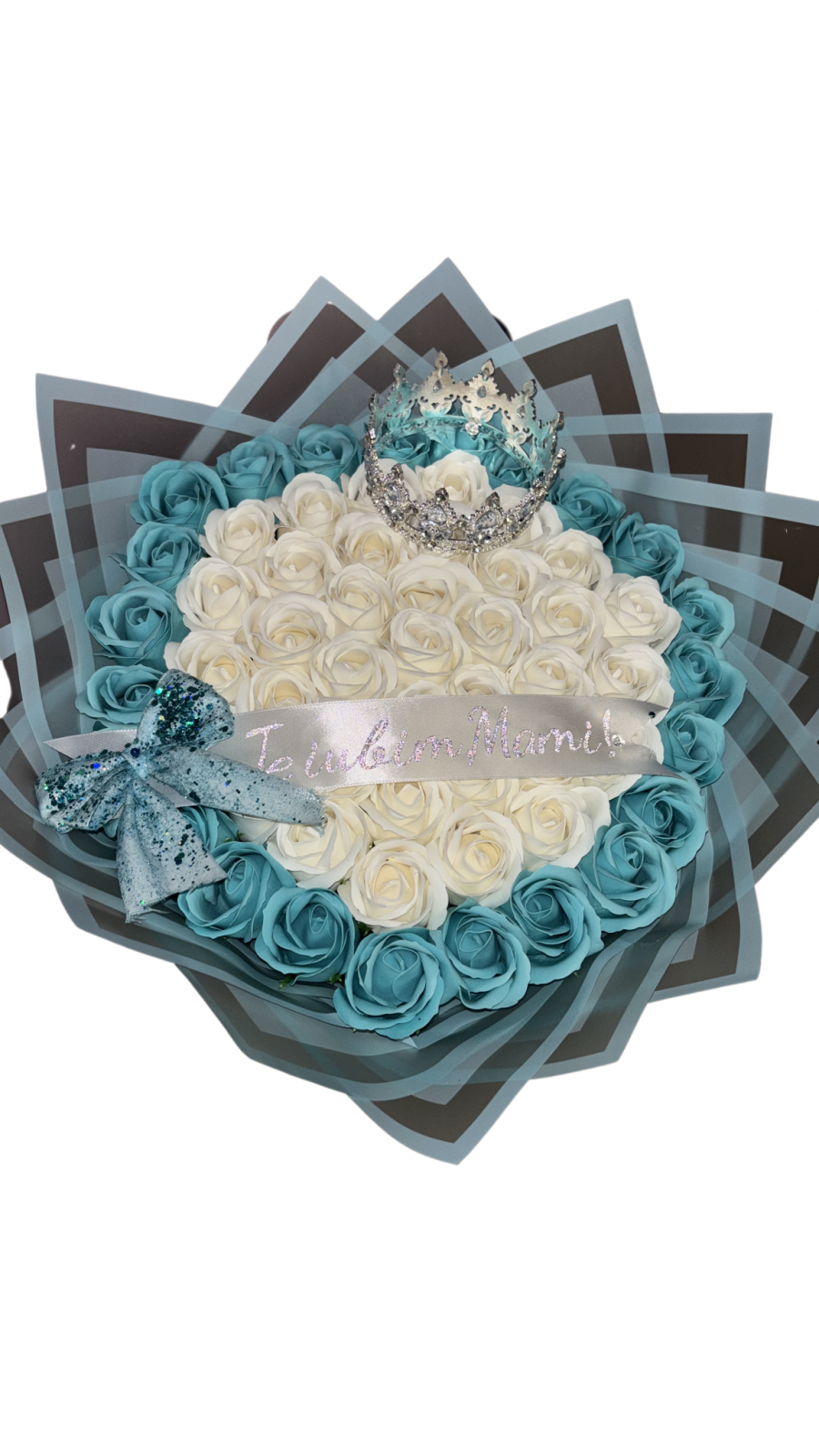 Buchet cu 59 de trandafiri de sapun alb cu turcoaz