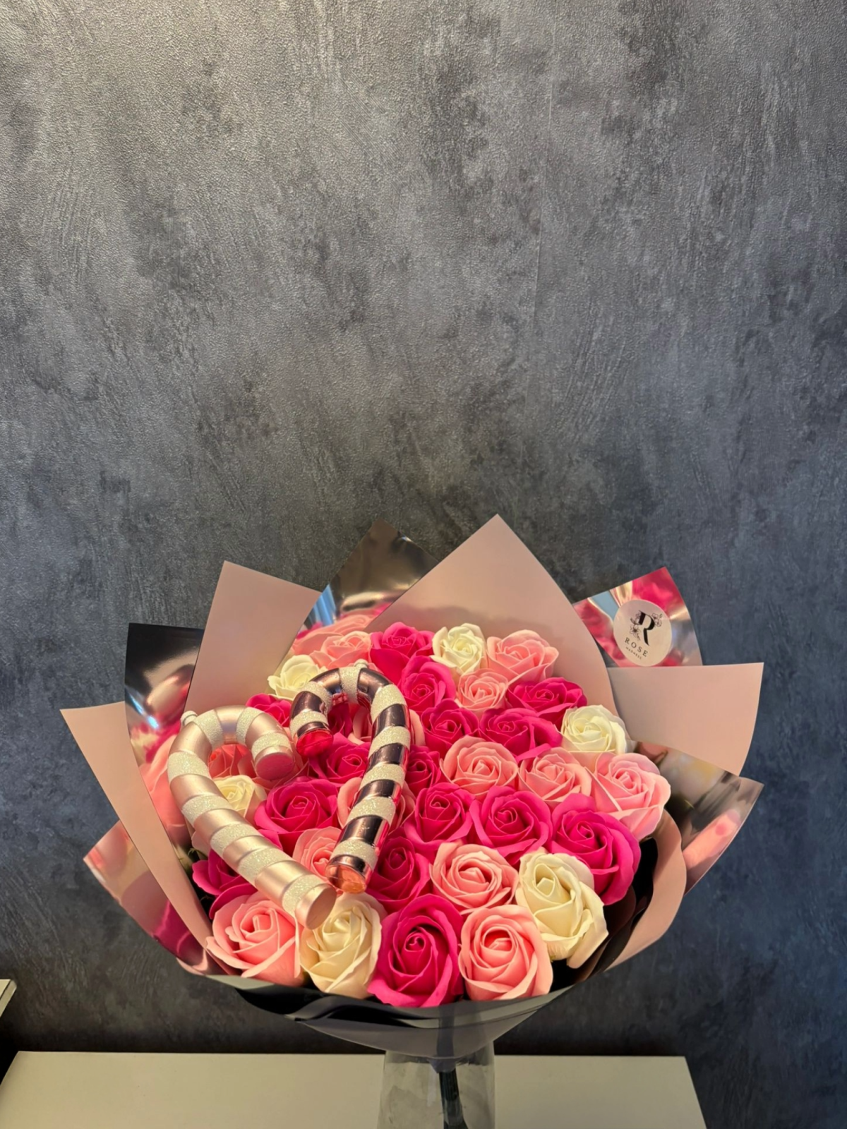 Buchetul contine 37 trandafiri din sapun și două bastonașe roz de tip candy cane, aranjate in formă de inimă.