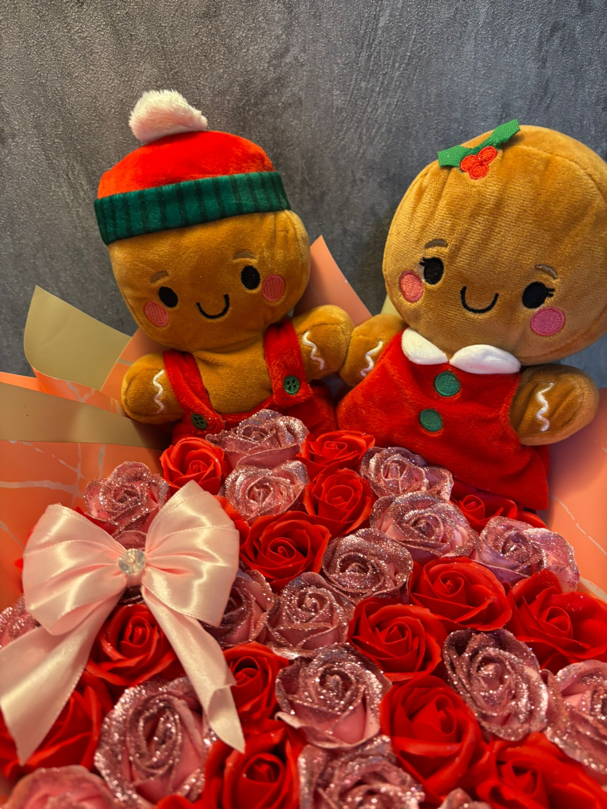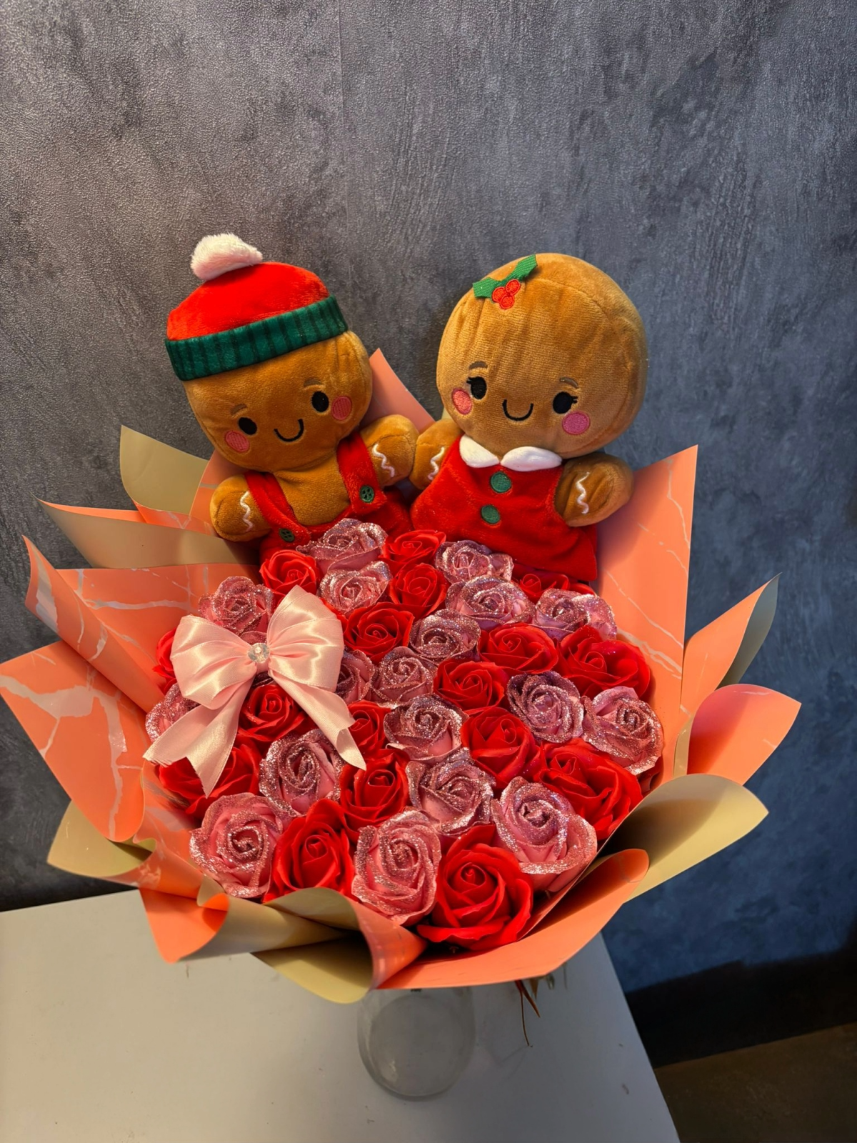 Buchetul contine 37 trandafiri din sapun,sclipici pe trandafirii roz inchis, o fundiță și 2 Gingerbread.