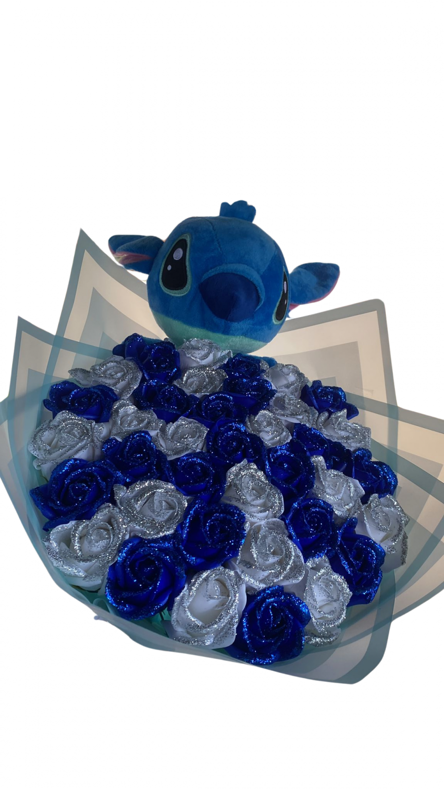 Buchetul contine 37 de trandafiri albastru si alb cu sclipici si stitch.